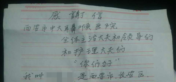 据何奶奶邻居张大爷透露,自她老伴离开后以前挺开朗的一个人,很少再看到她笑的这么开心了,回到家跟我们这些邻居唠嗑时总不自觉的说到西安新城中大耳鼻喉医院的来长荣教授,说他治好了自己的耳朵,真的很感谢!这不,还特意亲笔写了封感谢信。